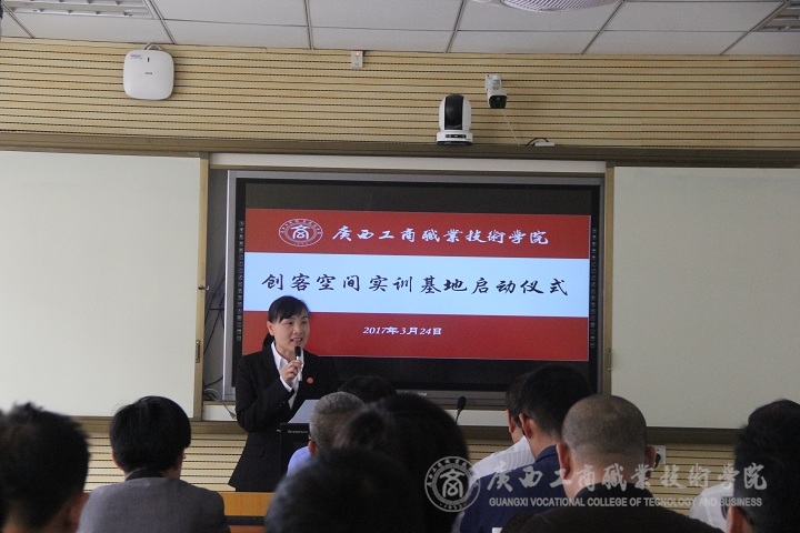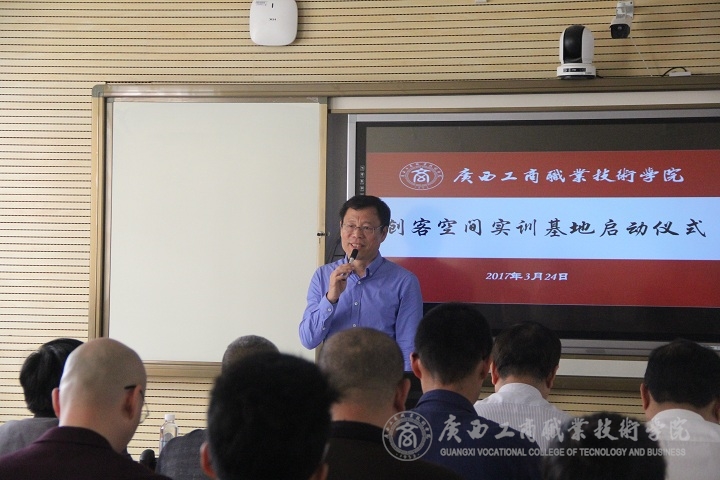 2017年3月24日上午9時,廣西工商職業(yè)技術學院創(chuàng)客空間實訓基地在校本部隆重啟動。廣西國際電子商務中心副主任張學青、廣西壯族自治區(qū)就業(yè)局創(chuàng)業(yè)指導科副科長騰幸宇、廣西電子商務行業(yè)指導委員會主任委員、廣西電子商務協(xié)會會長黃光強、廣西農(nóng)小二農(nóng)業(yè)科技有限公司總經(jīng)理江洪建以及20余家企業(yè)代表、部分新聞媒體代表、兄弟院校領導和專家應邀參加啟動儀式;學院副院長李維率教務處副處長蘇波、學院團委副書記趙婷、財信系有關負責人以及電商教研室全體教師參加本次啟動儀式。啟動儀式由財信系覃遠霞主任主持。