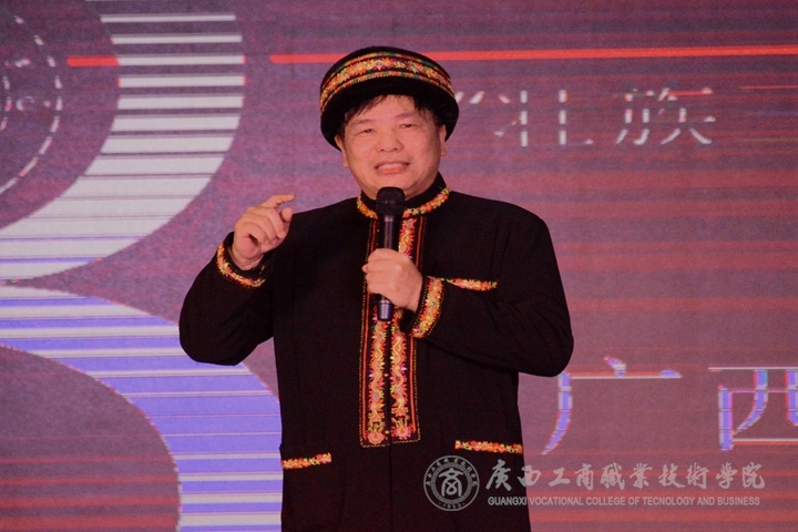 活動由傳說中的“瑤哥”,宣傳部部長韋勝強擔(dān)任主持人。他身著瑤族服裝,戴瑤族帽,一上場就給現(xiàn)場師生不一樣的視覺感受。介紹活動嘉賓和活動安排后,“瑤哥”含著笑將舞臺交給活動主講人蒙啟成副書記。