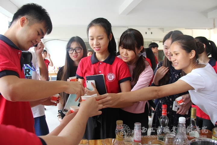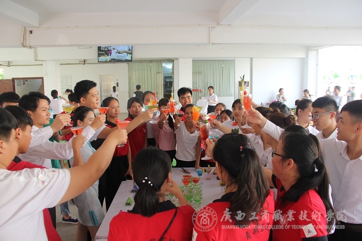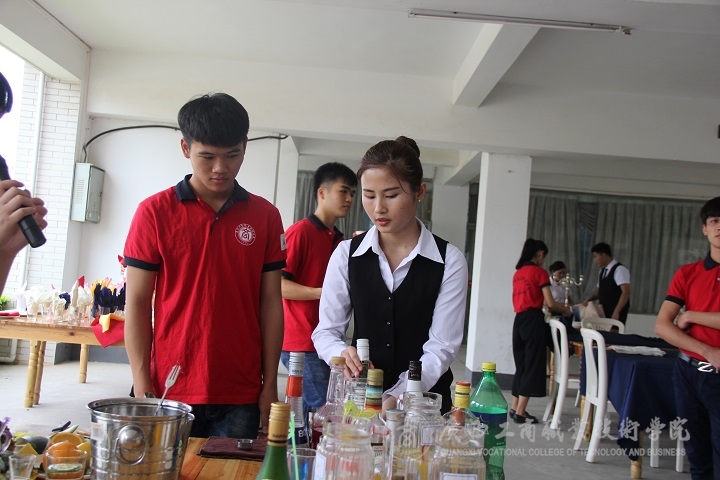 展演到了高潮環(huán)節(jié)。主持人邀請了兩位酒店專業(yè)的學生進行現(xiàn)場調(diào)酒大比拼,令聲一響,他們便開始忙碌起來,熟練的動作,從容而不失風采。短短的幾分鐘,他們便調(diào)出了自己心儀的酒來,還主動邀請現(xiàn)場觀眾來品嘗。觀眾們喜笑顏開,喝了一杯,還想再來一杯!展演中還邀請了兩位非酒店專業(yè)的學生現(xiàn)場調(diào)酒,專業(yè)調(diào)酒人員手把手教學,耐心地指導著。