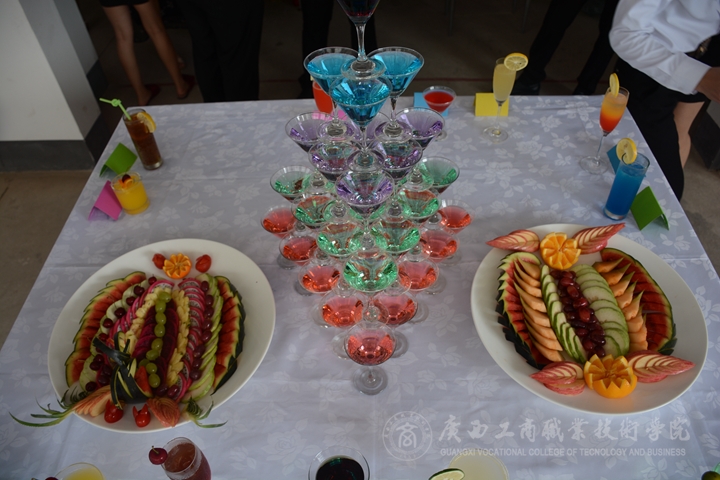 只見活動開始,調(diào)酒師們調(diào)制了五種顏色不一樣的雞尾酒,并將它們搭建成一座“金字塔”,成為展演過程中的一大亮點,吸引了許多同學圍觀并拍照留念。