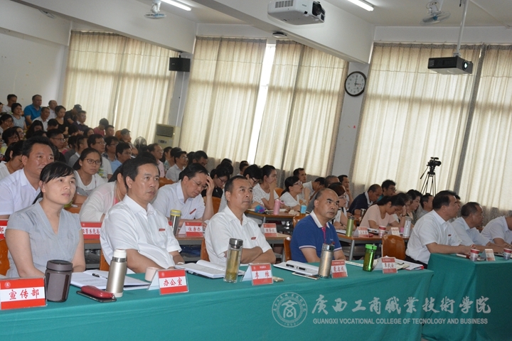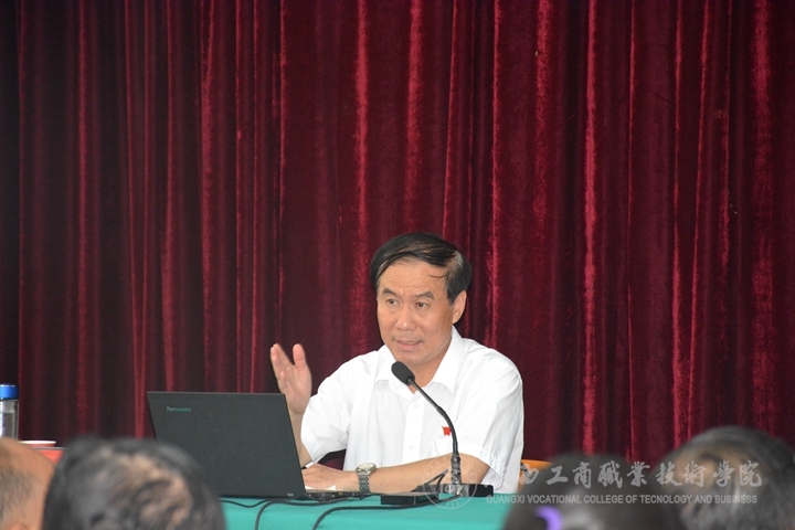 2017年7月11日(周二)下午,廣西工商職業(yè)技術(shù)學(xué)院全體教職員工齊聚校本部報(bào)告廳,召開學(xué)習(xí)貫徹習(xí)近平總書記視察廣西重要講話精神宣講報(bào)告會(huì)。報(bào)告會(huì)邀請自治區(qū)政協(xié)委員、廣西政協(xié)文史和學(xué)習(xí)委員會(huì)副主任(正廳級) 黃健教授作主題為《學(xué)習(xí)貫徹習(xí)近平總書記視察廣西重要講話精神》專題輔導(dǎo)報(bào)告。會(huì)議由學(xué)院黨委書記覃武云同志主持。