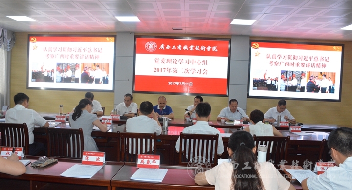 廣西工商職業(yè)技術(shù)學(xué)院于2017年7月11日下午,在校本部召開黨委理論學(xué)習(xí)中心組2017年第二次學(xué)習(xí)會(huì)。學(xué)院領(lǐng)導(dǎo)班子成員、學(xué)院各部門負(fù)責(zé)人、學(xué)院各系黨總支、直屬黨支部書記、工會(huì)負(fù)責(zé)人、團(tuán)委負(fù)責(zé)人參加了本次會(huì)議。會(huì)議由黨委書記覃武云同志主持。