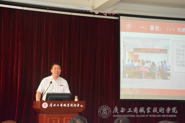 ?????? 隨后,由陳杰做開學工作報告。陳杰主要從暑假工作、開學工作、學期重點工作三大方面進行報告。他回顧總結了暑假期間黨建、教學、學工、人才、服務、民生、武鳴校區(qū)建設等各項工作開展情況,并做了開學工作及學期重點工作安排。報告將“堅持黨的領導,落實管黨治黨、辦學治校主體責任”等六項黨建工作和持續(xù)推動以“提高教師素質”為重點的教學水平升級等五項行政工作作為重點工作。
