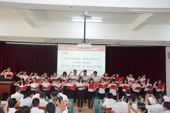 ?????? 會上,20多名新進教師在黨委組織部(人事處)副部長陶榮的帶領下上臺進行入職宣誓儀式?!拔倚模褐艺\人民教育事業(yè),貫徹黨的教育方針。為人師表,敬業(yè)愛生。 勤于育人,善于創(chuàng)新,勇于實踐,樂于奉獻。為國家立心,為民族鑄魂!”隨著一聲聲鏗鏘有利的誓言響起,全場響起一片熱烈的掌聲。