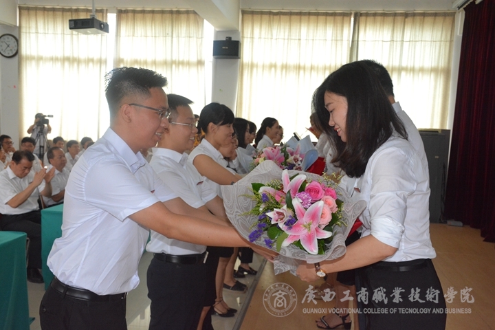 ? ? ? ? 第二項議程是舉行2017年上半年導師授證儀式。儀式上,陳杰同志與導師們握手并頒發(fā)聘書。青年教師給導師獻花行鞠躬禮,教師表示感謝,合影留念。