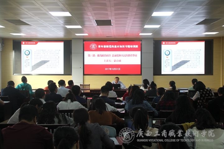 ? ? ? ? ?2017年10月31日下午15:00,學(xué)院在校本部報告廳召開青年教師黨的基本知識專題培訓(xùn)會,全體青年教師參加了培訓(xùn),培訓(xùn)會由學(xué)院黨委副書記、紀(jì)委書記蒙啟成主講, 這是本學(xué)期培訓(xùn)班第三次開課。? ? ? ? ? ? ? ? ? ? ? ? ? ? ? ? ? ? ? ??