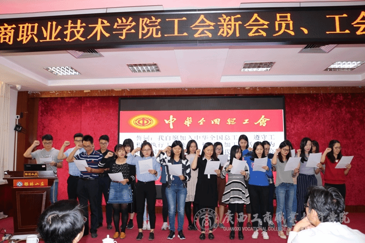 ? ? ? ? 近日,學(xué)院工會在南寧市會議中心第二綜合會議室舉辦了新會員、工會干部培訓(xùn)班暨新會員入會儀式。學(xué)院工會主席蒙啟成、常務(wù)副主席陳承偉、專職副主席王桂玲及學(xué)院工會干部和新會員參加了本次培訓(xùn)。本次培訓(xùn)由學(xué)院工會常務(wù)副主席陳承偉主持,王桂玲副主席代表學(xué)院工會向新會員的入會表示歡迎和祝賀,同時(shí)圍繞工會的基本職能、會員的權(quán)利與義務(wù)以及黨的十九大精神、習(xí)近平總書記談工會等方面,為全體參訓(xùn)人員作了深入細(xì)致的講解,并就計(jì)生工作方面的相關(guān)知識,向新會員作了介紹。最后,蒙啟成主席發(fā)表講話,要求全體工會干部要以高度的政治責(zé)任感和歷史使命感履職盡責(zé),做好“四種人”, 團(tuán)結(jié)引領(lǐng)廣大職工群眾聽黨話、跟黨走,建功立業(yè), 以實(shí)際行動迎接新時(shí)代,展現(xiàn)新作為。