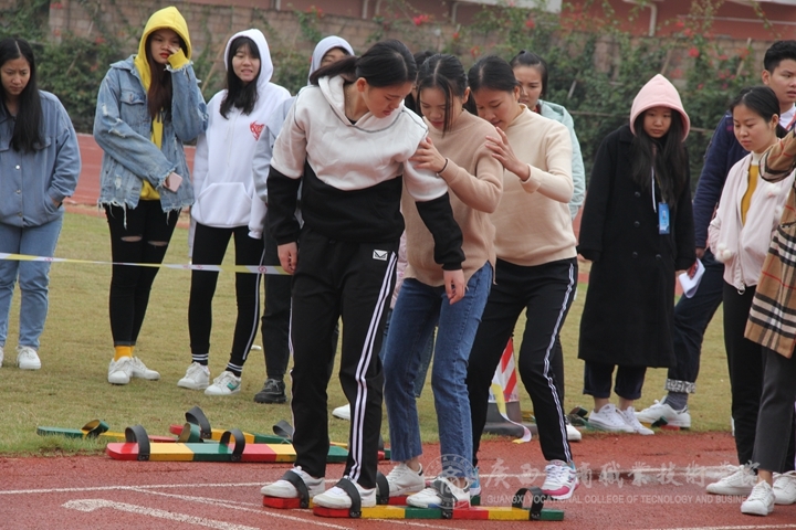 板鞋比賽上,運動員們在起跑線上全神貫注地等待發(fā)令聲響起,賽道周圍擠滿了前來加油助威的各系拉拉隊,他們充滿激情的吶喊聲縈繞在整個田徑場中。隨著發(fā)令聲響起,運動員們板鞋拍打跑道的聲音有節(jié)奏地響起,運動員們配合默契,不停地喊著“一二一,一二一”“左右左,左右左”的口號,雙臂快速而有力地?fù)]動著,在賽道上大步前行,以整齊的步伐向終點邁去。跑道濕滑,運動員們一次次的摔倒,又一次次的爬起,堅持不懈,不到終點不罷休。