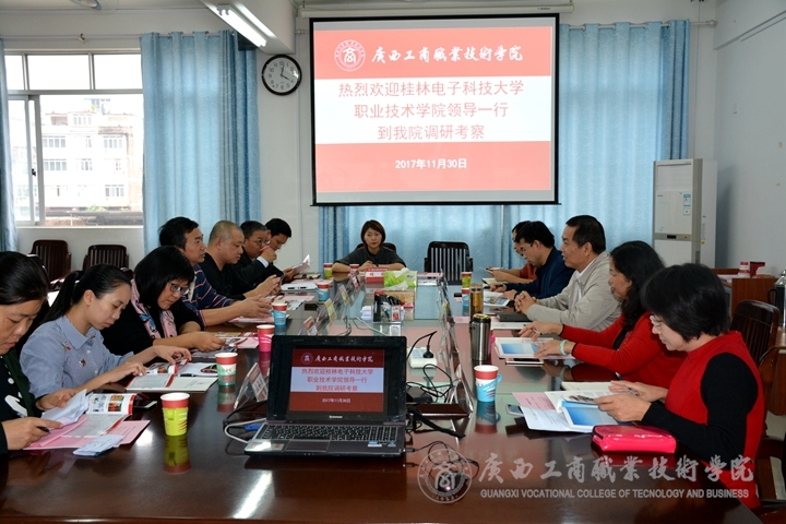 ? ? ? ? 11月30日下午, 桂林電子科技大學(xué)職業(yè)技術(shù)學(xué)院院長(zhǎng)唐寧、副院長(zhǎng)袁泉、副院長(zhǎng)李曉記及教學(xué)口相關(guān)負(fù)責(zé)人前來(lái)我院交流,學(xué)院副院長(zhǎng)李維率我院教學(xué)口相關(guān)負(fù)責(zé)人熱情的接待了唐寧一行。
