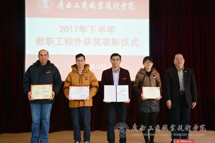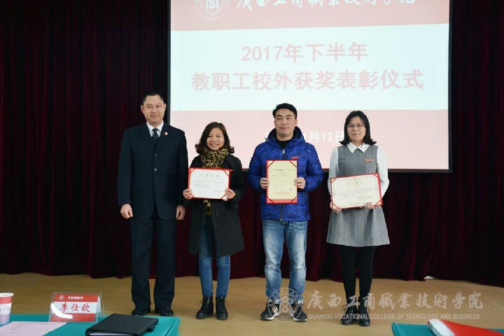 ??????? 會(huì)上,蒙啟成首先宣讀了2017年下半年退休人員名單,并由李仕欽和李維為退休人員頒發(fā)榮休證書和榮休紀(jì)念品。接著,蒙啟成對(duì)《關(guān)于2017年度學(xué)院教職工榮獲校外集體獎(jiǎng)和個(gè)人獎(jiǎng)項(xiàng)目的情況通報(bào)》進(jìn)行宣讀,并對(duì)獲獎(jiǎng)的教師表示祝賀和肯定。表彰儀式上,由李仕欽,李維,陳寧春分別為獲獎(jiǎng)教師代表頒獎(jiǎng)。