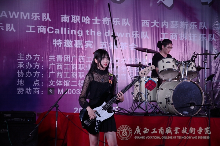 ? ? ? ? 首先出場(chǎng)的是來(lái)自廣西大學(xué)行健文理學(xué)院的“槍紅樂(lè)隊(duì)”,“槍紅樂(lè)隊(duì)”是一支流行搖滾風(fēng)格的樂(lè)隊(duì),為我們帶來(lái)了《我的天空》等歌曲,樂(lè)隊(duì)精彩的表演把現(xiàn)場(chǎng)的氣氛帶動(dòng)起來(lái),現(xiàn)場(chǎng)氛圍熱烈。