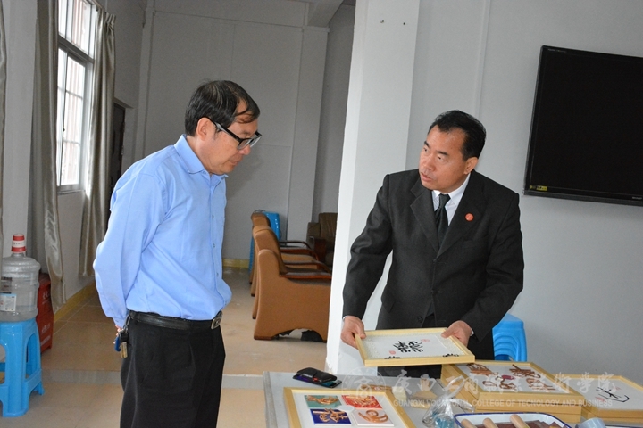 ? ? ? ? 2017年10月16日,自治區(qū)教育廳副巡視員陳衛(wèi)蒞臨我院,在院長陳杰的陪同下,視察我院藤瓷書藝工作坊發(fā)展建設情況。