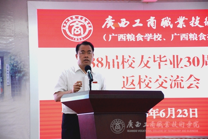 ??????? 現(xiàn)場播放學(xué)院形象宣傳片后,陳杰院長發(fā)表了熱情洋溢的講話。在講話中,他把學(xué)校的人才培養(yǎng)歸結(jié)為四句話:緣于招生、精于培養(yǎng)、成于就業(yè)、名于社會,并且回顧了88屆校友在校學(xué)習(xí)的場景,回顧了廣商院發(fā)展的歷程和曾經(jīng)面臨的種種困境,解釋了為何要進(jìn)軍武鳴,建設(shè)武鳴新校區(qū)的原因,并表達(dá)了對教師們、校友們和對廣商院的美好祝愿。