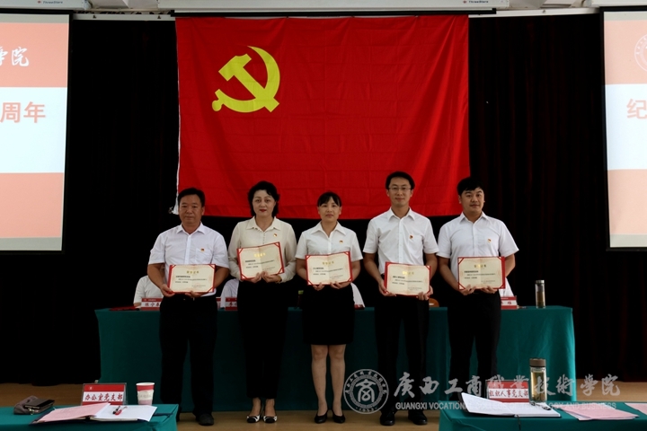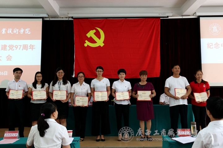 ??????? 6月26日下午,我院于鵬飛校區(qū)教學(xué)樓會(huì)議室召開中共廣西工商職業(yè)技術(shù)學(xué)院委員會(huì)慶祝中國共產(chǎn)黨建黨97周年黨員大會(huì)。全體在職教職工黨員、離退休教職工黨員代表、新入黨學(xué)生黨員參加本次會(huì)議,本次會(huì)議由院長陳杰同志主持。