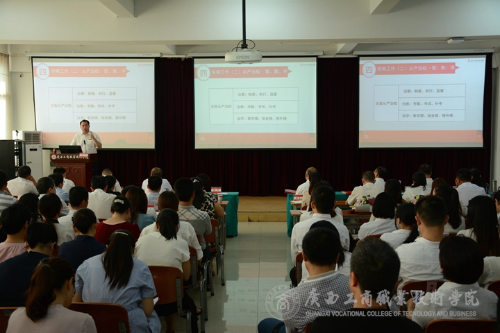 會(huì)議的最后議程由陳杰同志作開學(xué)工作報(bào)告。大會(huì)上,陳杰同志主要從暑假工作、招生工作、開學(xué)工作和學(xué)期工作四大方面進(jìn)行報(bào)告,他回顧總結(jié)了暑假期間黨建、教務(wù)教學(xué)、服務(wù)、招生、建校等各項(xiàng)工作開展情況,并做了2018年秋季學(xué)期工作安排。他提出本學(xué)期工作要全面從嚴(yán)治黨,統(tǒng)籌做好下半年工作;全面從嚴(yán)治校,突出治管、治教、治學(xué);加強(qiáng)規(guī)劃落實(shí),攻堅(jiān)“十三五”后三年;加強(qiáng)隊(duì)伍建設(shè),為學(xué)院發(fā)展奠定人才基礎(chǔ)。