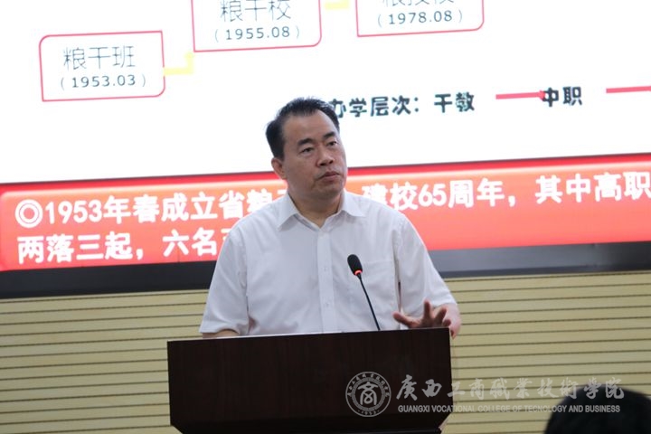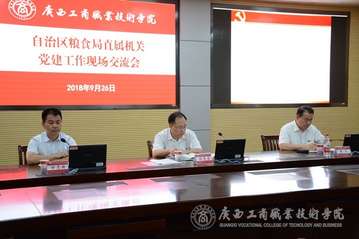 會議第二項議程,由廣西工商職業(yè)技術(shù)學(xué)院院長、黨委副書記陳杰,廣西南寧糧食儲備庫黨支部書記、主任黃世領(lǐng),廣西臨桂糧食儲備庫黨支部書記、主任曾憲余,局機關(guān)行政第一黨支部組織委員朱愛國發(fā)表講話,進行現(xiàn)場交流會經(jīng)驗交流。會上,院長陳杰對學(xué)院做了簡介,并結(jié)合學(xué)院黨建工作實際作三大點發(fā)言:一是完善黨建工作機制;二是推進黨的六大建設(shè);三是黨建工程推動發(fā)展。