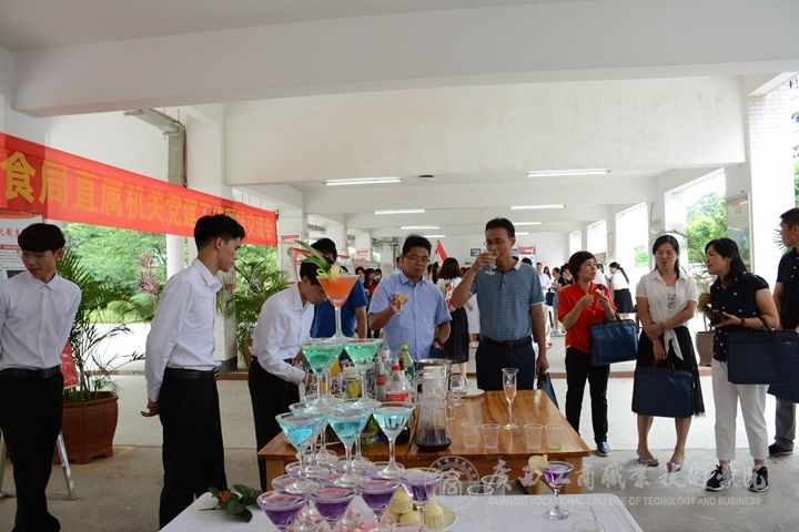 現(xiàn)場交流會,與會人員品嘗我院酒店管理專業(yè)學(xué)生調(diào)酒作品