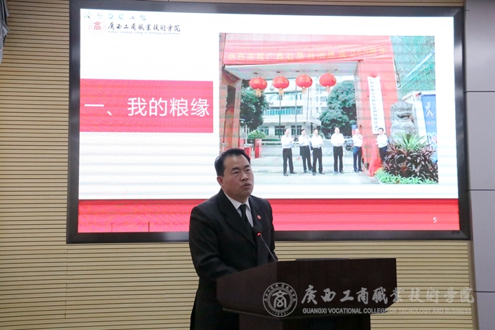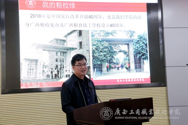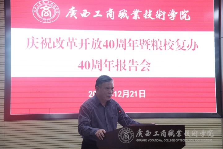 曾任廣西貿(mào)易經(jīng)濟(jì)學(xué)校校長(zhǎng)、黨委書記,廣西工貿(mào)、工商職業(yè)技術(shù)學(xué)院院長(zhǎng)陸炳堅(jiān)同志,現(xiàn)任廣西糧油質(zhì)量檢驗(yàn)站站長(zhǎng)陸炳堅(jiān)同志通過(guò)一組組圖片帶領(lǐng)大家一起見(jiàn)證了學(xué)院的發(fā)展,他回顧當(dāng)年學(xué)院申報(bào)大專院校時(shí)的情景,他表示廣商院人的敬業(yè)精神可歌可泣,當(dāng)時(shí)學(xué)院用3-5年的時(shí)間將學(xué)校升格為大專院校來(lái)之不易,學(xué)院的發(fā)展凝聚了幾代商院人的心血。