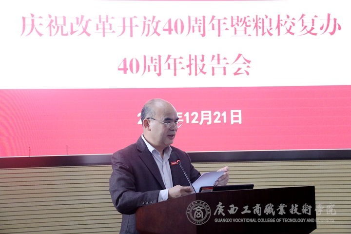 覃武云同志在致辭中對(duì)校友與師友能重返校園作報(bào)告表示衷心的感謝,他指出,學(xué)院復(fù)辦糧校40年來(lái),學(xué)院經(jīng)歷了一段改革創(chuàng)新、砥礪前進(jìn)的歲月,學(xué)院辦學(xué)條件逐漸優(yōu)化,內(nèi)涵建設(shè)不斷加強(qiáng)。這些輝煌成績(jī)和寶貴經(jīng)驗(yàn)是一屆屆領(lǐng)導(dǎo)班子和廣大師生員工銳意改革、艱苦奮斗取得的。為此,他代表學(xué)校向?yàn)閷W(xué)院改革發(fā)展事業(yè)貢獻(xiàn)智慧和力量的廣大師生員工致以最崇高的敬意,向關(guān)心和支持學(xué)院建設(shè)發(fā)展的廣大校友表示衷心的感謝,希望師生員工繼續(xù)保持奮斗姿態(tài)投入改革實(shí)踐,開(kāi)創(chuàng)新的更大的輝煌。并預(yù)祝此次報(bào)告會(huì)圓滿順利。
