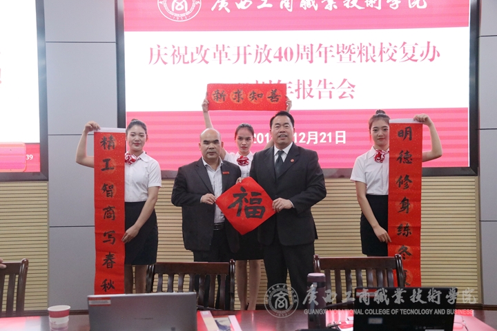 ? ? ?最后,學(xué)院院長(zhǎng)陳杰同志作總結(jié)發(fā)言。他指出,廣商院四十年從復(fù)校辦學(xué)到成為全國(guó)重點(diǎn)中專院校,再升級(jí)為大專院校,一路向西如長(zhǎng)征一般艱苦奮斗、披荊斬棘,這些年也取得了眾多驕人成績(jī)。現(xiàn)在又要開(kāi)始新征程,要從教學(xué)水平、管理能力、教育信息化等為重點(diǎn)的“三大升級(jí)”,全面打造更優(yōu)質(zhì)優(yōu)化的廣商院,廣商院的未來(lái)還有詩(shī)和遠(yuǎn)方的田野。最后,他為大家獻(xiàn)上自己為廣商院提筆的對(duì)聯(lián),上聯(lián):“明德修身練冬夏”,下聯(lián):“精工智商寫春秋”,橫批:“新求知善”。祝福廣商院發(fā)展越來(lái)越好,年年高升。