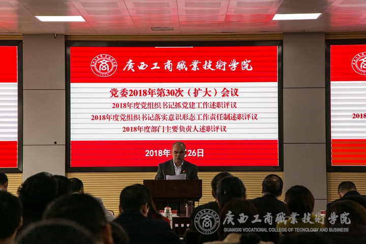 2018年12月26日上午,學(xué)院黨委于校本部2119會議室召開2018年第三十次(擴大)會議,專題聽取各黨總支、各直屬黨支部書記和各部門主要負(fù)責(zé)人作2018年度述職報告。學(xué)院黨委書記覃武云、黨委副書記、紀(jì)委書記蒙啟成、副院長、黨委委員李仕欽、副院長、黨委委員李維、副院長、黨委委員陳寧春、黨委委員蔣百平、黨委委員林雯出席會議,本次會議由覃武云主持。學(xué)院中層管理人員、教代會代表、各黨總支、直屬黨支部委員、組織員、黨委部門職工代表列席。