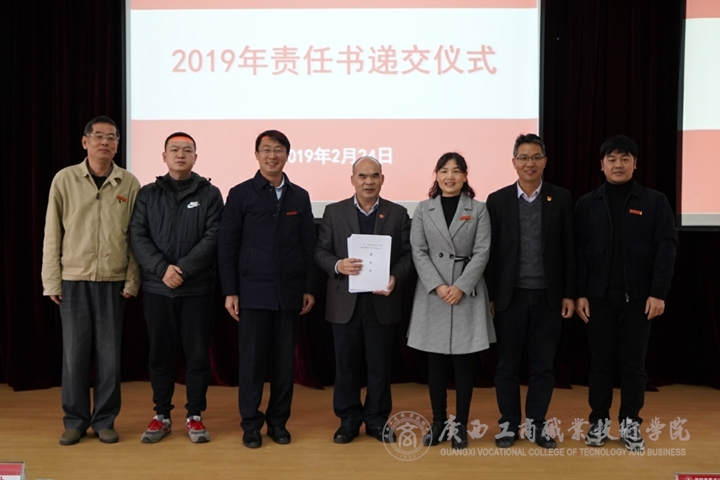 ? ? ? ? 會議第一項議程是遞交責任書儀式。為了推動2019年黨建工作、意識形態(tài)工作和安全穩(wěn)定工作的落實,進一步壓實工作責任,學院黨委與各黨總支、直屬黨支部書記簽訂《2019年黨建工作目標責任書》、《2019年落實意識形態(tài)工作主體責任責任書》,與各黨組織、各部門、各單位主要負責人簽訂《2019年安全穩(wěn)定工作責任書》。會上,各黨組織、各部門、各單位主要負責人依次向學院遞交責任書,由覃武云同志代表學院黨委接收責任書。