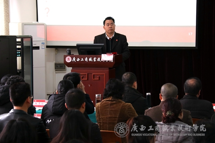? ? ? 會議的第四項議程是由陳杰同志做題為《一年之計在于春——在2019年春季開學大會上的講話》開學工作報告。他緊緊圍繞:年度工作遵循、黨的全面領導、以教學為中心、管理服務育人、工作重大專項五大方面做報告。最后,他引用習近平總書記2019年發(fā)表的新年賀詞“我們都在努力奔跑,我們都是追夢人”,勉勵全體廣商院教職員工在新的一年里,努力取得更多好成績。