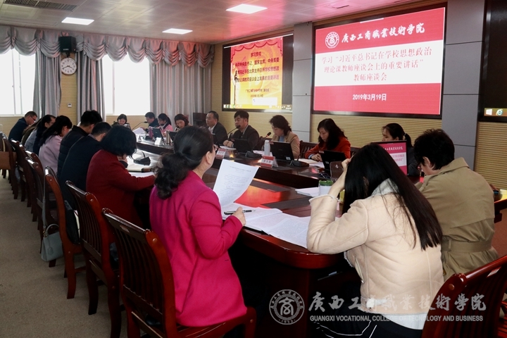 ??????? 2019年3月19日下午,我院新時代講習所在鵬飛校區(qū)視頻會議室召開“學(xué)習習近平總書記在學(xué)校思想政治理論課教師座談會上的重要講話精神”教師座談會,并將該座談會作為我院新時代講習所成立以來講習活動的第一講。學(xué)院新時代講習所副所長、黨委副書記、紀委書記蒙啟成出席講習活動并主持會議,思政部全體思想政治理論課教師參加了會議,宣傳部、教務(wù)科研處、學(xué)生工作部、教師工作部派代表參加了會議。