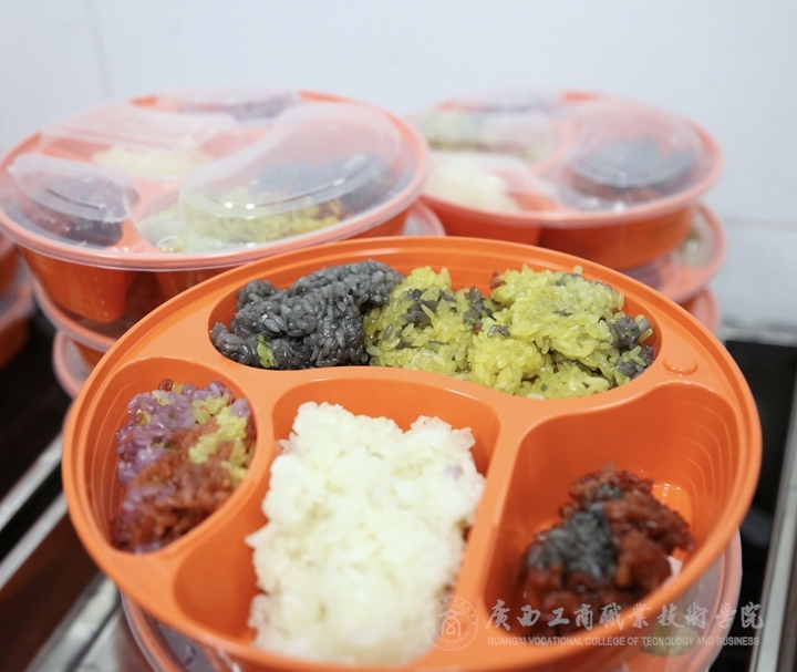 ????? 據(jù)食堂阿姨介紹,壯族民間制作五色糯米飯分5種顏色:黑色染料是楓樹葉(又稱烏飯葉),紅色染料多用紅蘭草(也有人用大紅葉、什錦葉),黃色染料系黃姜、黃花或梔子,紫色用紫蘭藤。傳統(tǒng)的制作都需浸泡一天以上才能完整上色,為此阿姨拿出提前上色好的米放入蒸籠中蒸約一個(gè)小時(shí),便可蒸出黑、紅、黃、紫、白五種顏色的糯米飯來。糯米飯做好后同學(xué)們都上前幫忙一起拿出來。五色糯米飯色澤鮮艷、晶瑩透亮;五色糯米飯吃起來滋潤柔軟、醇正平和,味道富有植物清香,令人回味無窮;不僅如此,它還具有一定的藥用價(jià)值。