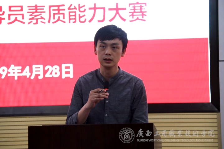 ? ? ? ? 為了推動我院輔導(dǎo)員隊伍職業(yè)化、專業(yè)化發(fā)展,提升輔導(dǎo)員職業(yè)能力以及工作的科學(xué)化學(xué)水平, 4月28號下午15:00,我院于鵬飛校區(qū)教學(xué)樓視頻會議室舉辦2019年輔導(dǎo)員素質(zhì)能力大賽。參賽選手要求在崗并專職從事輔導(dǎo)員工作2年以上,本次比賽共有13名輔導(dǎo)員參加。比賽邀請了廣西大學(xué)團委宣傳部陳霄老師、廣西幼兒師范高等學(xué)校團委書記、學(xué)生工作處副處長戴世琴、南寧職業(yè)技術(shù)學(xué)院學(xué)生黨支部書記黃小釗三人擔(dān)任評委,黨委學(xué)生工作部副部長林雯、各系黨總支書記、副書記及相關(guān)人員40余人到場觀看比賽。
