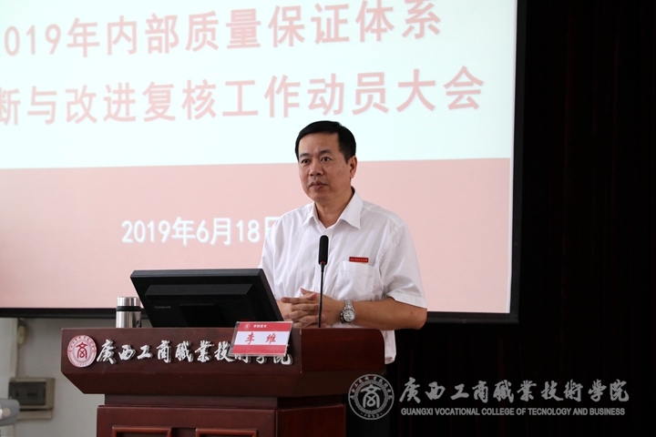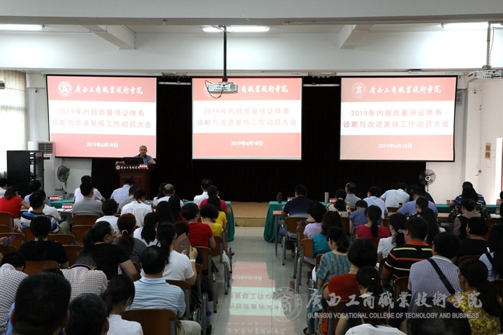 ? ? ? ? 為順利迎接學(xué)院內(nèi)部質(zhì)量保證體系診斷與改進復(fù)核工作,2019年6月18日下午,我院于鵬飛校區(qū)教學(xué)樓報告廳召開2019年內(nèi)部質(zhì)量體系診斷與改進復(fù)核工作動員大會,學(xué)院黨委書記覃武云、院長李維、黨委副書記、紀委書記蒙啟成出席了本次會議,全體中層干部、各系部全體教師、教務(wù)科研處、黨委教師工作部、黨委學(xué)生工作部、評估督導(dǎo)室、現(xiàn)代教育技術(shù)中心相關(guān)人員參加了本次會議。本次大會由黨委書記覃武云主持,院長李維在會上做動員講話。?