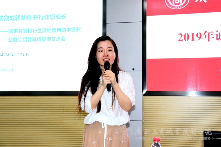 ? ? ? ? 為進(jìn)一步做好學(xué)生誠(chéng)信教育,更好地開(kāi)展學(xué)院生源地信用助學(xué)貸款工作,傳播誠(chéng)信、感恩,激勵(lì)正能量,我院開(kāi)展了一系列學(xué)生資助誠(chéng)信教育主題活動(dòng)。7月5日下午,我院于鵬飛校區(qū)教學(xué)樓視頻會(huì)議室舉辦2019年誠(chéng)信教育主題講座,進(jìn)行金融誠(chéng)信教育和國(guó)開(kāi)行生源地信用助學(xué)貸款業(yè)務(wù)宣介。黨委學(xué)生工作部全體人員、各系黨總支書記、分管學(xué)工副主任、2017級(jí)、2018級(jí)輔導(dǎo)員,各系2017級(jí)、2018級(jí)已獲生源地信用助學(xué)貸款學(xué)生代表參加本次講座,會(huì)議特邀國(guó)家開(kāi)發(fā)銀行廣西分行客戶五處副處長(zhǎng)劉曉宇擔(dān)任主講人。講座由學(xué)工部副部長(zhǎng)林雯主持。