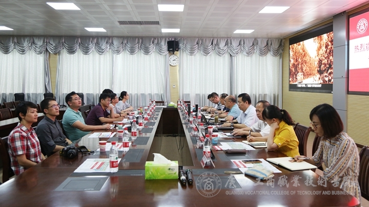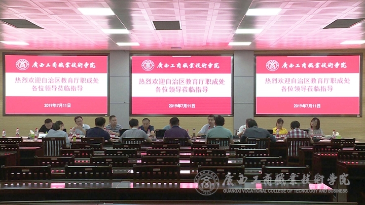 ??????? 7月11日下午,自治區(qū)教育廳職成處處長(zhǎng)覃壯才、副處長(zhǎng)黃云奇一行7人蒞臨我院檢查指導(dǎo)工作并開展“不忘初心、牢記使命”專題調(diào)研活動(dòng)。學(xué)院全體領(lǐng)導(dǎo)班子成員和相關(guān)部門負(fù)責(zé)人參加座談交流。