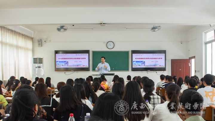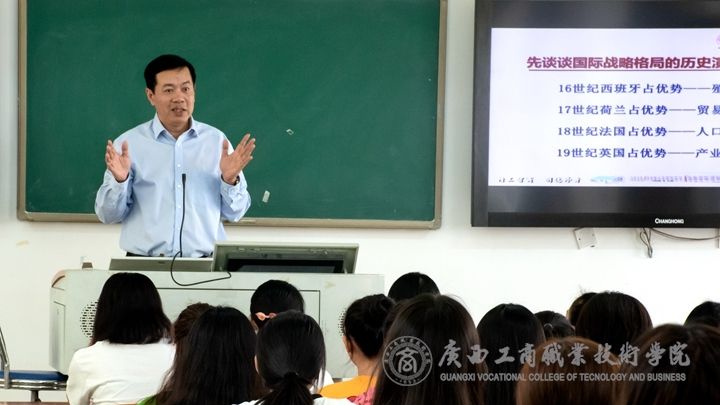 ??????? 2019年9月18日上午,廣西工商職業(yè)技術(shù)學(xué)院李維院長來到了教學(xué)樓2407教室,為2019級工商企業(yè)管理專業(yè)1909和1910班新生作了題為“對當(dāng)前國際形勢熱點(diǎn)的觀察與思考”的專題授課。思政部主任劉萬英教授,教師代表岑郁、劉源益、韋慧妮、龔麗萍、王興華、莫曉靜、李榮真、韋靜、羅嚴(yán)嚴(yán)、李明聆聽了授課。
