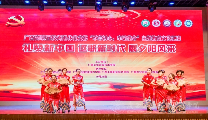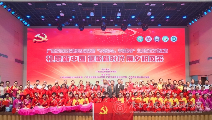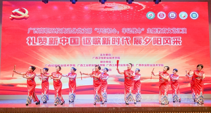 ??????? 金秋時(shí)節(jié),美在身邊。10月28日晚,我院與廣西衛(wèi)生職業(yè)技術(shù)學(xué)院、廣西經(jīng)貿(mào)職業(yè)技術(shù)學(xué)院、廣西工業(yè)職業(yè)技術(shù)學(xué)院、廣西農(nóng)業(yè)職業(yè)技術(shù)學(xué)院等五所高職院在廣西衛(wèi)生職業(yè)技術(shù)學(xué)院學(xué)術(shù)報(bào)告廳共同舉辦離退休同志“不忘初心、牢記使命”主題教育文藝匯演。學(xué)院黨委副書(shū)記蒙啟成、廣西衛(wèi)生職業(yè)技術(shù)學(xué)院黨委書(shū)記李超乾、廣西經(jīng)貿(mào)職業(yè)技術(shù)學(xué)院黨委副書(shū)記杜遠(yuǎn)陽(yáng)、老年日?qǐng)?bào)廣西聯(lián)絡(luò)站長(zhǎng)陳成光等領(lǐng)導(dǎo)嘉賓出席活動(dòng),有200多名老同志參加了活動(dòng)。