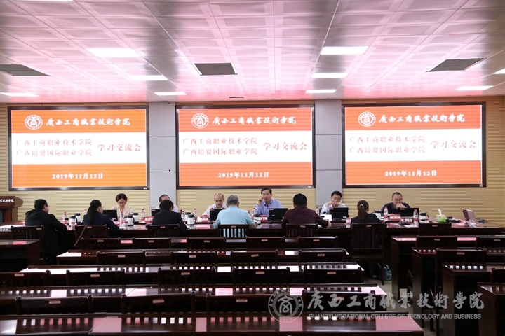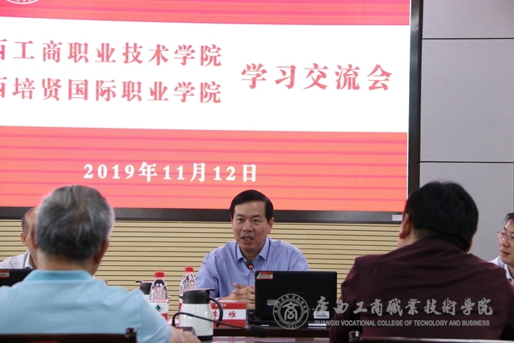 ? ? ? ? 隨后,交流雙方在我院鵬飛校區(qū)會議室開展學習交流座談會。會上,首先播放了我院宣傳片,李維院長結(jié)合宣傳片內(nèi)容,從我院辦學歷史、辦學規(guī)模、辦學專業(yè)、師資隊伍、辦學理念、辦學成果等方面介紹了學校的基本情況。接著由鄭華副書記介紹我院“不忘初心、牢記使命”主題教育工作開展情況;蔣百平部長介紹學院黨的組織建設、黨建品牌項目建設、黨員活動創(chuàng)新形式等工作開展情況;最后林寧校長發(fā)言,他表示,我院選派譚波同志到廣西培賢國際職業(yè)學院掛職擔任學院黨總支書記、督導專員,在優(yōu)秀的師資、規(guī)范的管理,較強的教學科研能力中發(fā)揮了良好的帶頭作用。他對廣商院66年披荊斬棘的發(fā)展歷史表示感慨,對我院所獲得的教學成果獎充分肯定贊賞,并表示將向我院學習,狠抓教師隊伍的建設,狠抓教師能力的建設,狠抓教師科研能力的提升。
