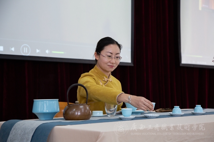 根據(jù)我院本學(xué)期的學(xué)術(shù)活動(dòng)日安排,由公共部主承辦、經(jīng)管系協(xié)辦、主題為《中華茶藝》的學(xué)術(shù)講座,于2019年12月13日下午在學(xué)院報(bào)告廳舉行。南寧市芳君默工作室創(chuàng)辦人、高級(jí)茶藝技師、高級(jí)評(píng)茶師劉芳老師應(yīng)邀到校講座。公共基礎(chǔ)部教師和經(jīng)管系學(xué)生約220人聆聽(tīng)了講座。