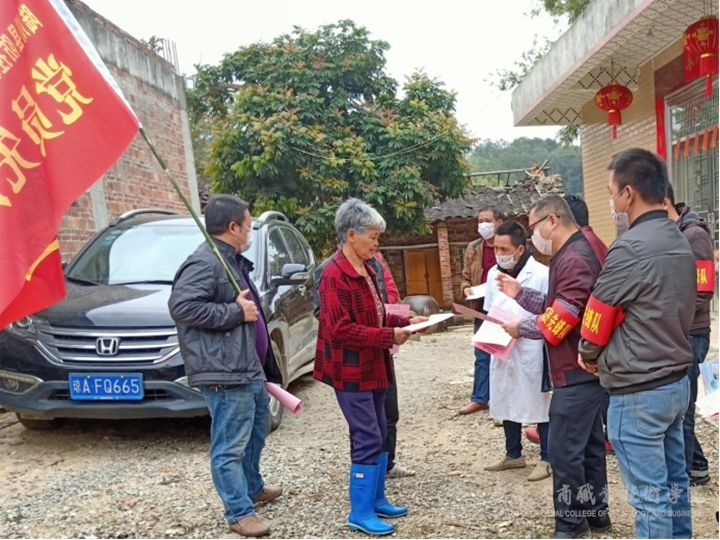“疫情就是命令!”學(xué)院派往陸川縣的第一書記們匆匆結(jié)束春節(jié)假期,返回駐守村開展防疫工作,他們克服村居道口分散的困難,快速完成道路設(shè)卡排查,安排人員24小時輪流值守。迅速組織隊伍入戶做疫情檔案登記、張貼標語、拉橫幅、發(fā)放防疫宣傳單等,提醒村民做好防護措施,做到宣傳、排查全覆蓋,確保不漏一戶一人。