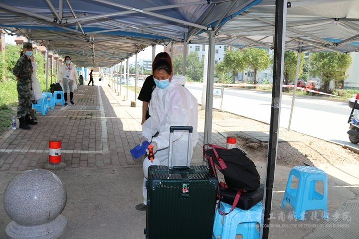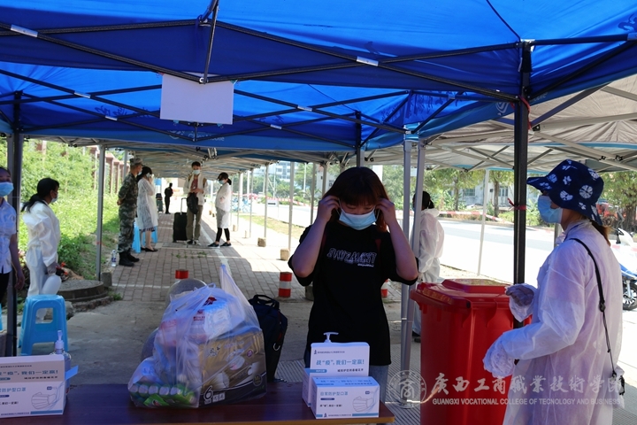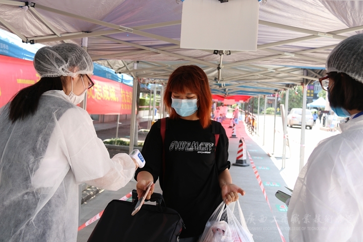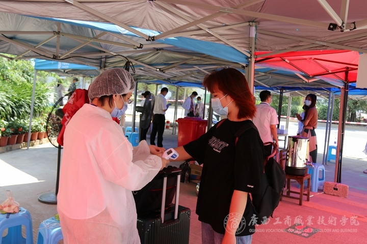 2020年5月6日上午11點,有著淡黃蓬松頭發(fā),穿著黑色T裇的黃小玲拉著大大的行李箱,背著手提電腦,拿著一袋零食,踏著輕快的步伐走出了地鐵口,又很快來到了廣西工商職業(yè)技術(shù)學院的大門外。在這里,一溜煙布好的帳篷和分列在不同崗位的教職員工已經(jīng)嚴陣以待,等待黃小玲的是一系列嚴格而細致的入校程序。