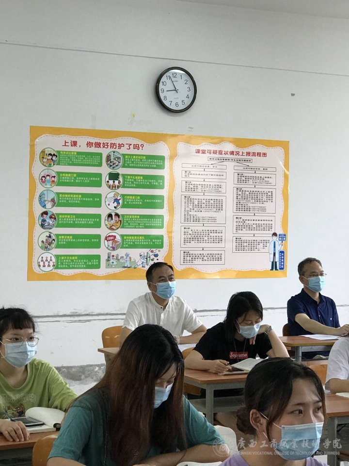 2020年5月11日是學(xué)生返校面授上課的第一天,學(xué)院黨委書記覃武云、副書記蒙啟成、教務(wù)科研處副處長李紅梅及會(huì)計(jì)系主任張首楠、副主任粟衛(wèi)紅等到上課教室開展開學(xué)第一課的聽課檢查活動(dòng)?! ●湓?、李紅梅、張首楠、覃鋆鋆等聽取了雷荔珺老師的《企業(yè)內(nèi)部控制》課程和王詩珣老師的《管理會(huì)計(jì)》課程,蒙啟成、汪波、粟衛(wèi)紅、吳明等聽取了盧海妮、邱越勝老師的《財(cái)務(wù)管理》和《管理會(huì)計(jì)》課程。在教室里,我們看到所有面授的教室都按要求在座位上貼了標(biāo)簽,學(xué)生老師全程配戴口罩按標(biāo)簽就座,進(jìn)教室后由班干測(cè)量體溫并用免洗洗手液消毒后進(jìn)入座位聽課。