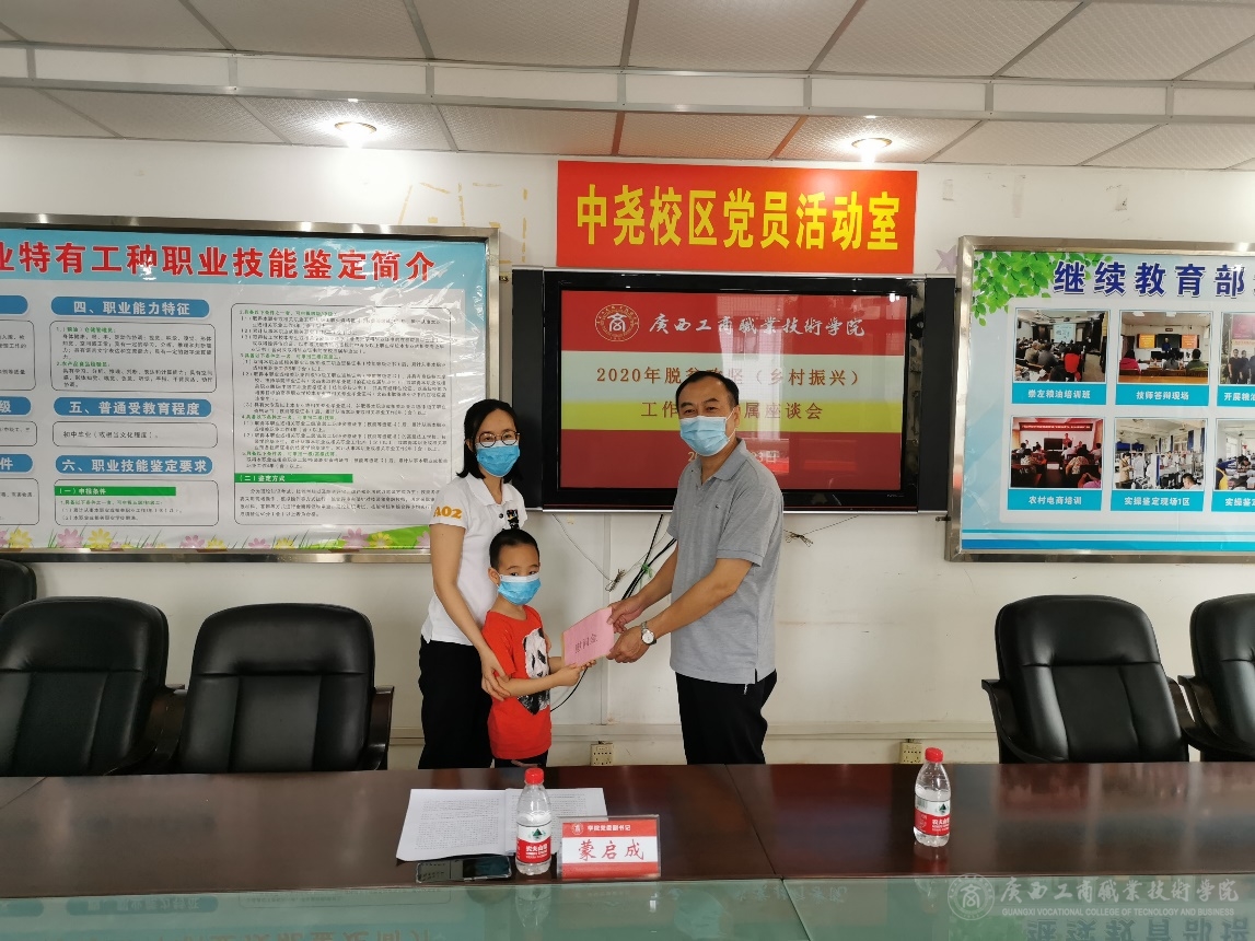 蒙啟成副書記與脫貧攻堅(鄉(xiāng)村振興)工作隊員家屬進(jìn)行了親切的交談,代表學(xué)院黨委對全體工作隊員兩年多來在脫貧攻堅(鄉(xiāng)村振興)工作中付出的努力與取得的成績表示肯定,對家屬們的理解與支持表示感謝。他指出,今年是脫貧攻堅決勝年,工作隊員們肩負(fù)著黨和人民的期盼,在脫貧攻堅一線為基層、為群眾服務(wù),體現(xiàn)了高校服務(wù)社會的責(zé)任和擔(dān)當(dāng)。在工作隊員們的背后,是家屬們的理解與支持,大家雖然不在扶貧一線,但是同樣也作出了犧牲和奉獻(xiàn)。他詳細(xì)了解了工作隊員的家庭情況和生活狀況,并表示學(xué)校作為幫扶后盾單位,將全力支持各位工作隊員在基層開展脫貧攻堅工作,積極幫助大家解決困難,為工作隊員消除后顧之憂。對居住地不在南寧的工作隊員家屬,組織人事部門通過電話、微信、短信等方式進(jìn)行了聯(lián)系溝通。