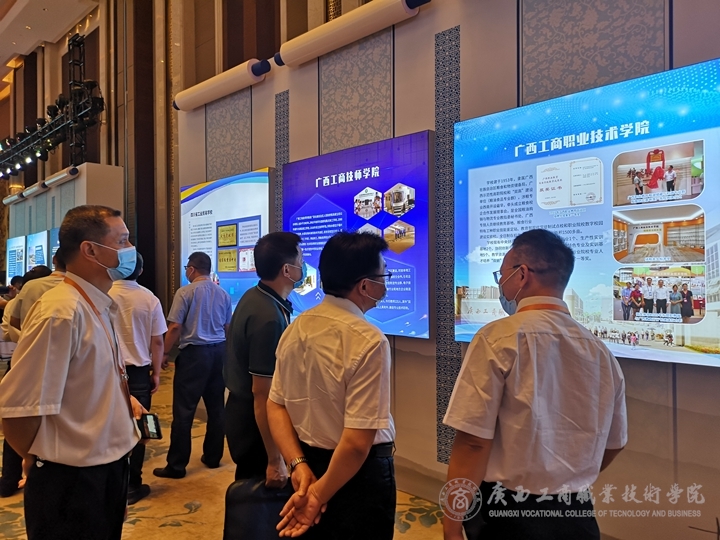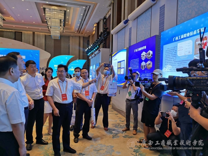 在與會領(lǐng)導(dǎo)嘉賓巡展環(huán)節(jié)過程中,吳局長特地就我們廣西參展的兩所糧食職業(yè)院校情況專門向國家糧食和物資儲備局張務(wù)鋒局長做了匯報講解。