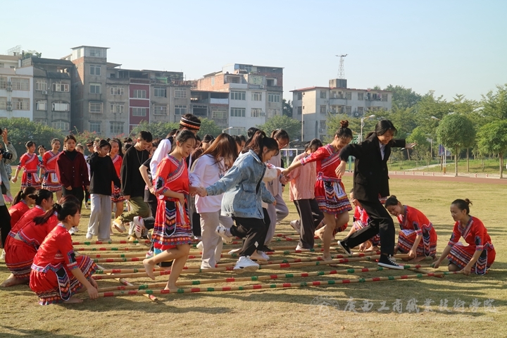 竹竿舞又稱跳竹竿,是一個以團隊合作為方式的舞蹈,具有濃厚的民族文化特色,是廣西壯族民間舞蹈形式之一?;顒娱_始前,管理學院的同學們身穿民族服裝在田徑場跳起了竹竿舞,引來無數(shù)師生的觀看,隨后,圍觀的同學紛紛加入了跳竹竿舞的行列里。初練竹竿舞的同學,有的因為跳錯了步伐就被夾掉了鞋子,有的因亂踩竹竿而仰面朝天。在經(jīng)過一系列的練習過后,學生們個個精神飽滿,動作標準到位,持竿者在音樂的節(jié)奏中蹲、站等姿勢變化多樣,在有節(jié)奏、有規(guī)律的碰擊聲里,跳舞者在竹竿分合的瞬間,在歡快的樂曲中,敏捷地進退,瀟灑地跨竿,演繹出美麗的舞蹈。
