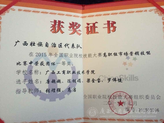 據(jù)來(lái)自無(wú)錫的最新消息,我院市場(chǎng)營(yíng)銷代表隊(duì)在今天下午剛剛結(jié)束的2015年全國(guó)職業(yè)院校技能大賽高職組市場(chǎng)營(yíng)銷技能比賽中榮獲團(tuán)體一等獎(jiǎng)!這是我院首次在同一類別的國(guó)賽中榮獲一等獎(jiǎng)!也是今年廣西參賽團(tuán)隊(duì)在高職組市場(chǎng)營(yíng)銷技能比賽中所獲得的唯一一個(gè)一等獎(jiǎng)!