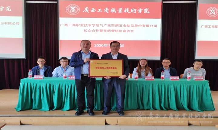 宣講會后經(jīng)貿(mào)學(xué)院張煌強(qiáng)院長與堅朗廣西區(qū)胡武軍總經(jīng)理為校企合作人才培養(yǎng)基地揭牌。