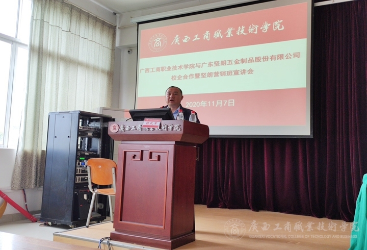 我院由經(jīng)貿(mào)學(xué)院牽頭與廣東堅朗五金制品股份有限公司校企合作暨堅朗營銷班宣講會于11月7日在鵬飛校區(qū)舉行。廣東堅朗五金制品股份有限公司廣西銷售區(qū)胡武軍總經(jīng)理、廣東堅朗五金制品股份有限公司人資部麥永嘉部長和經(jīng)貿(mào)學(xué)院院長張煌強(qiáng)副教授出席此次校企合作宣講會。