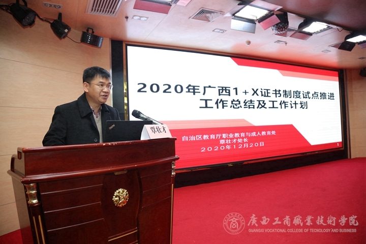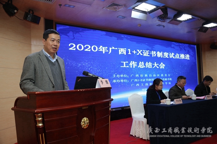 2020年12月20日上午,自治區(qū)教育廳在南寧相思湖國(guó)際大酒店四樓多功能會(huì)議廳召開(kāi)2020年廣西“1+X”證書(shū)制度試點(diǎn)推進(jìn)工作總結(jié)大會(huì)。自治區(qū)教育廳職業(yè)教育與成人教育處處長(zhǎng)覃壯才、廣西工商職業(yè)技術(shù)學(xué)院院長(zhǎng)李維、職業(yè)教育國(guó)家學(xué)分銀行與職業(yè)技能等級(jí)證書(shū)信息管理服務(wù)平臺(tái)的產(chǎn)品設(shè)計(jì)、技術(shù)研發(fā)與管理總監(jiān)鄧清泉等領(lǐng)導(dǎo),廣西“1+X”證書(shū)制度試點(diǎn)院校代表、培訓(xùn)評(píng)價(jià)組織單位代表、專家和特邀代表、廣西“1+X”秘書(shū)處工作人員參加本次大會(huì)。本次大會(huì)由自治區(qū)教育廳主辦,廣西1+X證書(shū)制度試點(diǎn)建設(shè)秘書(shū)處掛靠單位廣西工商職業(yè)技術(shù)學(xué)院承辦,由廣西工商職業(yè)技術(shù)學(xué)院副院長(zhǎng)闕勇平主持。