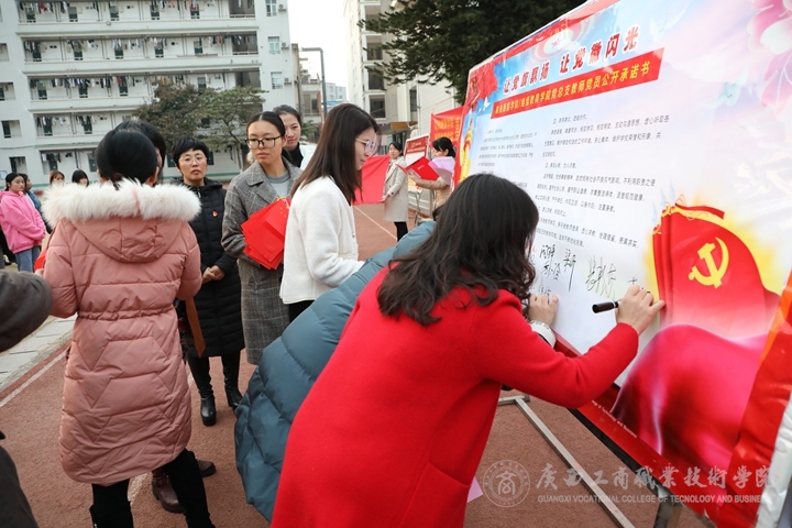 接著,糧油食品教研室黨支部書記陳秀霞老師率領(lǐng)學(xué)院全體教師黨員,面向黨旗做出莊嚴(yán)承諾。啟動儀式后,師生在祝福墻上留下對黨、對祖國的美好祝愿。