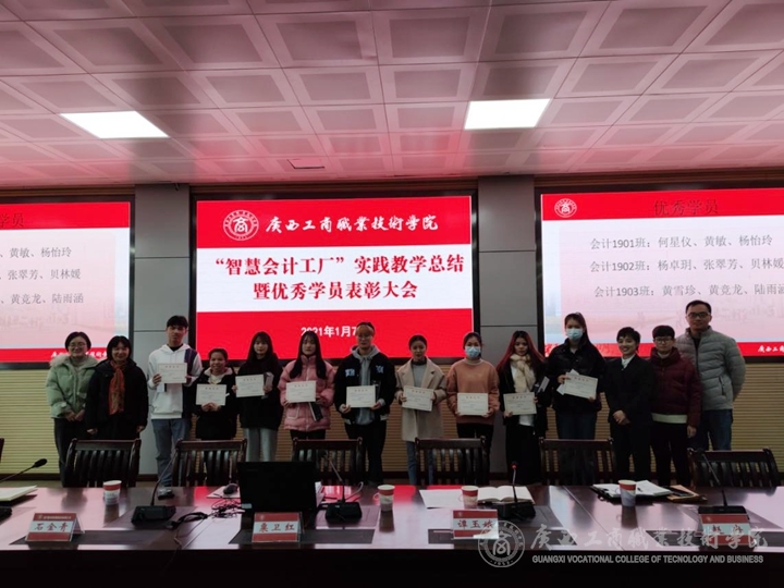 2021年1月7日下午,廣西工商職業(yè)技術(shù)學(xué)院會計(jì)學(xué)院在鵬飛校區(qū)2119會議室召開了“智慧會計(jì)工廠”實(shí)踐教學(xué)總結(jié)暨優(yōu)秀學(xué)員表彰大會。會計(jì)學(xué)院粟衛(wèi)紅院長、教學(xué)負(fù)責(zé)人譚玉娥、南寧橙米商務(wù)服務(wù)有限公司石金青經(jīng)理、教研室相關(guān)教師及2019級會計(jì)專業(yè)學(xué)生代表參加了會議。