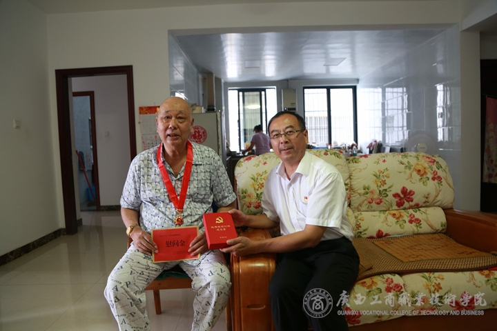 6月28日一早,覃武云、韋云鳳帶隊(duì)來(lái)到87歲、64年黨齡的老黨員李晶同志家中。覃書記詳細(xì)了解李老的身體健康狀況,并向李老簡(jiǎn)要通報(bào)學(xué)院當(dāng)前改革發(fā)展建設(shè)情況。覃書記代表學(xué)院為李老佩戴了“光榮在黨50年”紀(jì)念章,并送上慰問(wèn)金、慰問(wèn)品。因身體原因,李老說(shuō)話非常吃力,李老的愛(ài)人代表李老向前來(lái)慰問(wèn)的學(xué)院領(lǐng)導(dǎo)讀了其事先口述的信,他對(duì)組織的關(guān)懷表示感謝,并“希望后來(lái)的同志工作更好,讓共產(chǎn)主義事業(yè)在全世界興旺起來(lái)?!闭Z(yǔ)句情意真切,感人肺腑。